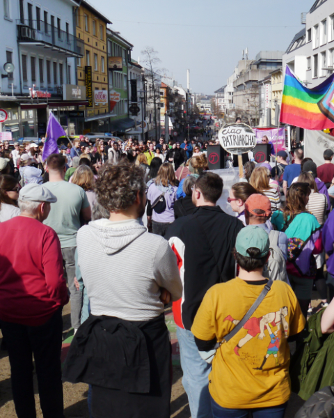 Am 8. März geht Darmstadt auf die Straße: Von 13:30 bis 15 Uhr demonstrierte das Bündnis FemStreikDA für Gleichberechtigung, Sichtbarkeit und Solidarität. Start war am Georg-Büchner-Platz, weiter über Ludwigsplatz und Marktplatz bis zum Friedensplatz mit: