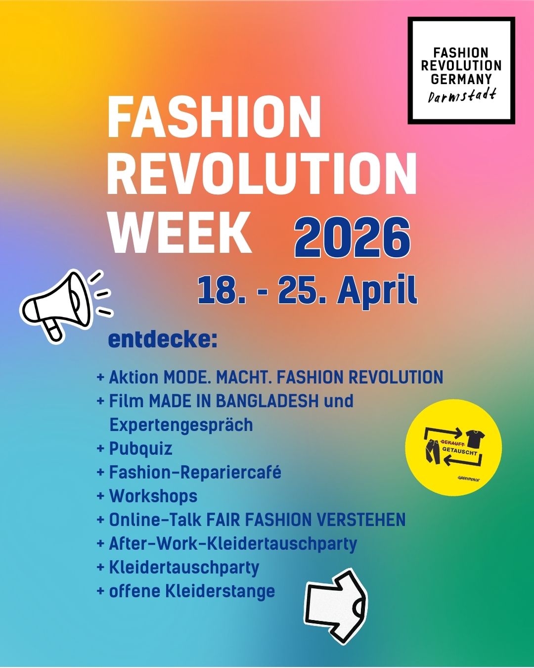 Vom 18. bis 25. April wird Darmstadt wieder zum Schauplatz der Fashion Revolution Week – sieben Tage voller Inspiration, Aktionen und Gemeinschaft für eine Mode, die Menschen und Planet respektiert. Du bist eingeladen, Teil dieser Bewegung zu werden!