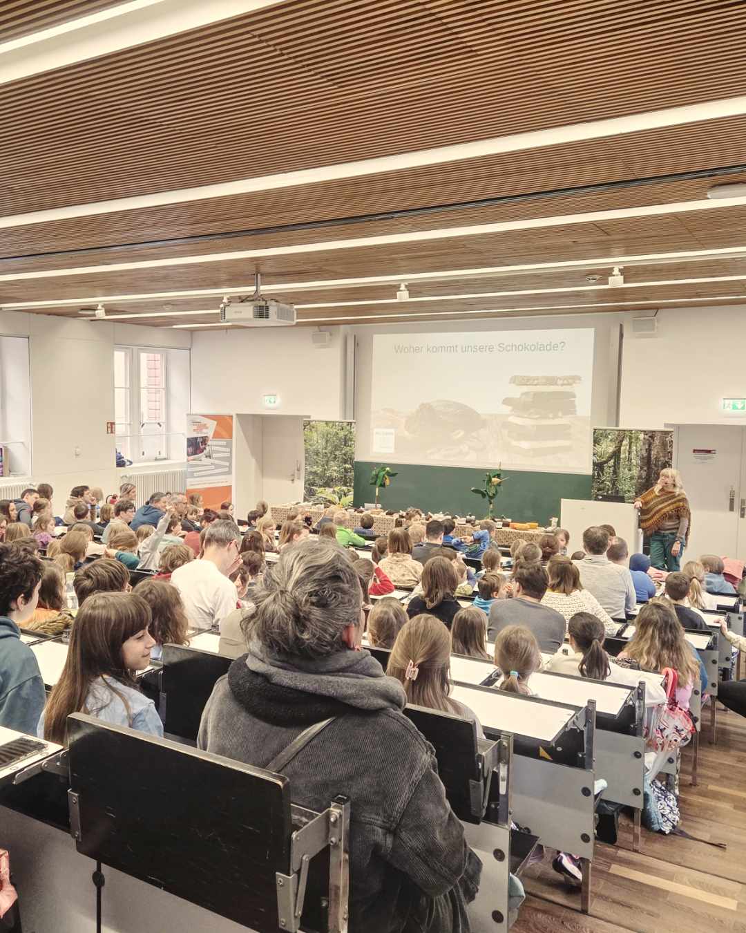 Am 14. März 2026 war der Weltladen Darmstadt zu Gast bei der Kindervorlesung der Bürgerstiftung Darmstadt – und der große Hörsaal im Schloss war bis auf den letzten Platz gefüllt! Über 100 neugierige Kinder und 30 Erwachsene tauchten mit uns in die bunte Welt des Kakaos ein.