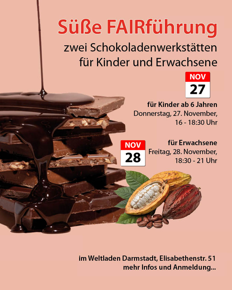 Wenn der Duft frisch gerösteter Kakaobohnen durch den Weltladen zieht, dann steht eines fest: Es wird süß, kreativ und fair! Ende November laden wir Kinder und Erwachsene ein, die Welt der Schokolade mit allen Sinnen zu entdecken – vom Kakaobaum bis zur eigenen, handgemachten Weihnachtsschokolade. Schokoladenwerkstatt für Kinder – Von der Kakaobohne zur SchokoladeIn unserer […]