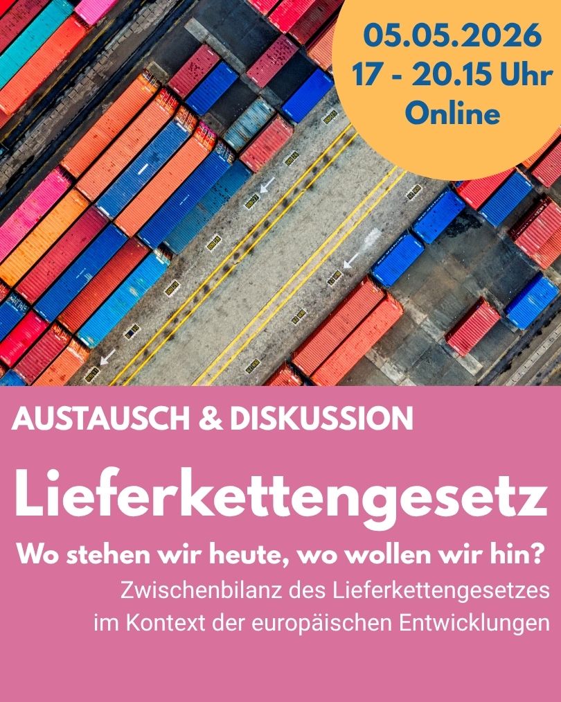 Veranstaltungsort: online Veranstalter: Arbeitsgemeinschaft der Eine Welt-Landesnetzwerke in Deutschland e.V. (agl) und andere Referent*innen: Dr. Carsten Stender (Bundesministerium für Arbeit und Soziales), Miriam Teweldebrhan, (Helpdesk Wirtschaft und Menschenrechte), Franziska Humbert […]