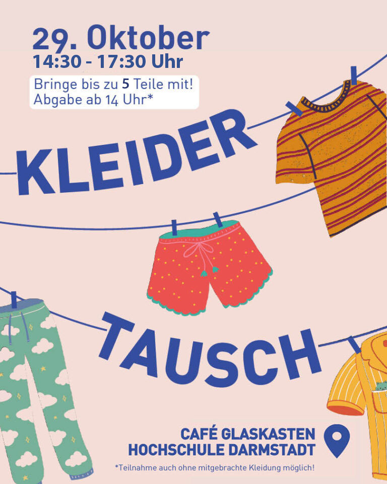 Bring bis zu 5 Teile mit, Abgabe ab 14 Uhr.Du kannst auch teilnehmen, ohne eigene Kleidung mitzubringen. Ort: Café Glaskasten, Schöfferstr. 3