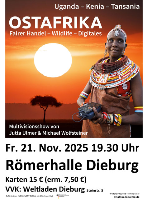 Der Eine Welt-Verein Dieburg lädt am Freitag, 21. November, um 19:30 Uhr zu einer eindrucksvollen Multivisionsshow in der Römerhalle Dieburg ein. Die Fotojournalist:innen Dr. Jutta Ulmer und Dr. Michael Wolfsteiner nehmen das Publikum mit auf eine farbenprächtige Reise durch Uganda, Kenia und Tansania – von den Nebelwäldern der Berggorillas über die Savannen der Serengeti bis […]