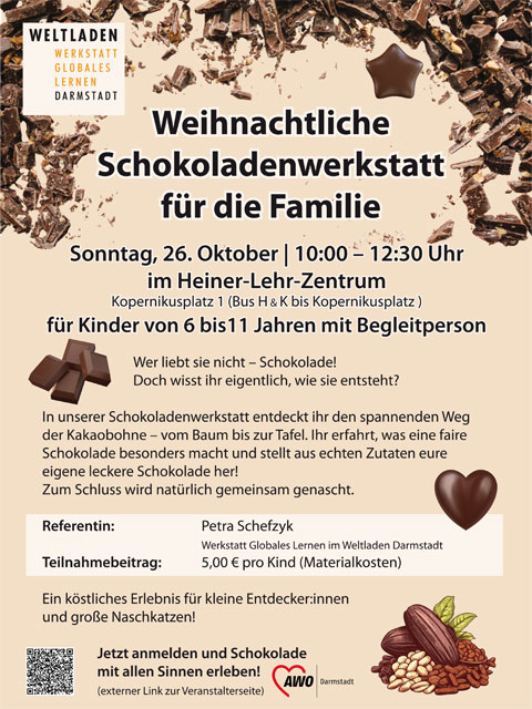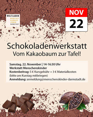 Woher kommt eigentlich unsere Schokolade? In der SchokoladenWerkstatt entdecken Kinder von 6 bis 11 Jahren den spannenden Weg der Kakaobohne – vom Baum bis ins Geschäft – und erfahren, was faire Schokolade so besonders macht. Natürlich stellen wir zusammen auch selbst Schokolade her und naschen gemeinsam. Samstag, 22. November | 14–16:30 UhrWerkstatt MenschenskinderKostenbeitrag: 5 € […]